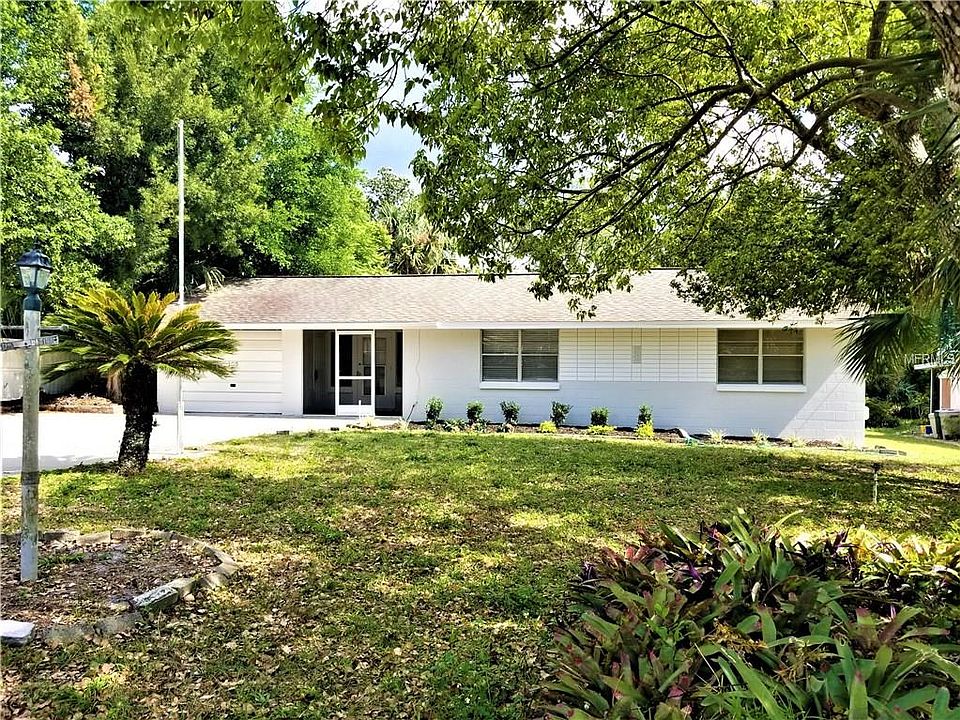 Welcome home! The newly landscaped front entry and screened in porch welcomes you into this beautiful lakefront home. You'll find yourself drawn through the large foyer right to the cozy sunroom overlooking Lake of the Woods. But don't forget to take a walk through the spacious living room with wood laminate floors and the eat-in kitchen with lake views along the way. Also gracing this space is a large utility room and an office that is easily converted to a third bedroom. The split floor plan offers two more bedrooms on the opposite side of the home providing much needed privacy. Moving outdoors you'll find yourself meandering through one of the largest lots on the lake. This ½ acre lot has majestic oaks that provide cool shade on sunny summer days, fruit trees and 75 feet of lake frontage. Fish, kayak, boat, or simply enjoy the serenity of the water and wildlife from your covered lanai. New paint inside and out, fresh landscaping, and a new electric panel means that you can move right in and immediately begin enjoying your new home. Don't miss this opportunity to live your lake house dream!