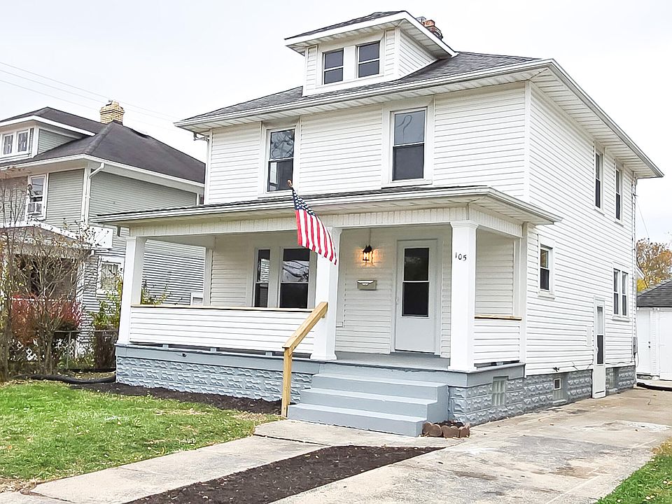 Step into your HGTV-worthy dream home—fully remodeled from top to bottom and crafted for comfort, style, and everyday ease. On the main level, the heart of the house is an open-concept kitchen and dining area centered by a spacious island. Enjoy brand-new cabinets, durable granite countertops, a stainless-steel dishwasher, and a double stainless-steel sink, all set against fresh paint and new lighting. Just beyond, a large living room invites game night, movie marathons, or quiet mornings with coffee. A convenient half bath serves the main floor. Designed with accessibility in mind, the home is wheelchair friendly and includes an exterior ramp for smooth, confident entry. Upstairs, find three comfortable bedrooms with new flooring and generous closets, plus a freshly remodeled full bathroom with a classic tub—perfect for unwinding. Storage is abundant: a walk-up attic for seasonal items and a full basement for totes, tools, or a future hobby space. Outside, the big backyard is ready for gardening, pets, and play. Quality upgrades deliver peace of mind: brand-new electric service, a new furnace, central air, a new water heater, and numerous additional electrical and plumbing improvements. Relax on the covered front porch—an ideal spot to watch the neighborhood wake up—or head to the one-car garage for easy parking and extra storage. Set on the east side of town, this convenient location offers quick access to Hwy 70 for an easy hop to Columbus, plus minutes to shopping, restaurants, and daily amenities. Throughout the home you'll appreciate the crisp, freshly painted interiors and new flooring in every room, and both bathrooms have been thoughtfully remodeled to feel bright, clean, and modern. If you've been waiting for the total package—a turnkey home with the look of a renovation show and the practicality real life demands—this is the one.