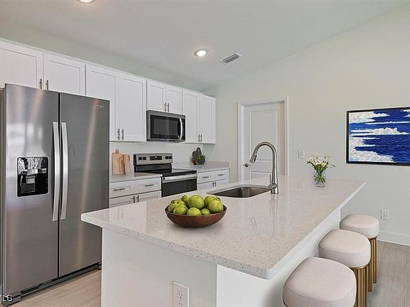 Experience the tranquility of the brand new Sunset Harbor Plan! Perfect for entertaining and multi-generational living, this home features porcelain tile flooring throughout, a heated inground pool and privacy fence. As you enter the foyer, the open floor plan with expansive sliders invites natural sunlight and serene views overlooking the pool. The modern kitchen includes stainless steel appliances, all wood shaker cabinets offering abundant storage quartz counters, and a large island with breakfast bar. Storage will not be a problem with the walk-in pantry perfect for the little extras! Live your best Sunlife with TWO LARGE PRIMARY SUITES featuring walk-in closets, tray ceilings, and full en-suite bathrooms. All the bedrooms have ceiling fans to keep you cool and comfortable throughout the year. Live your Florida Dream here! NO FLOOD ZONE + IMPACT WINDOWS = LOW INSURANCE. This is The Sunset Harbor Plan.