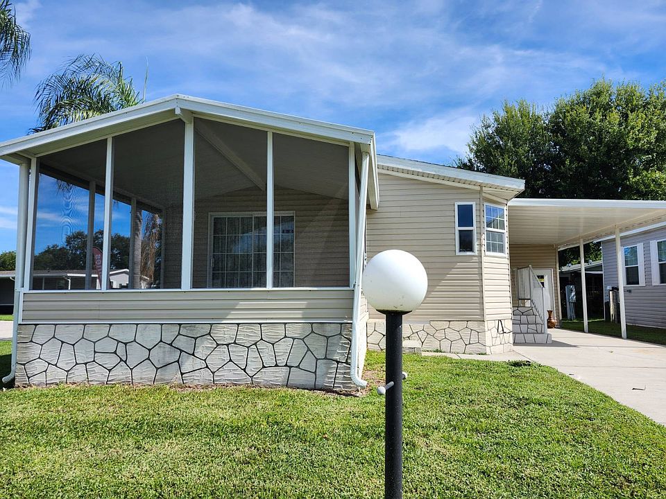 Charming 2006 2-bedroom 2 bath home, waiting for you to make it your home! This adorable and affordable home has many features such as, a spacious primary suite with ensuite bathroom, vanity with sink, large walk in shower, expansive wall length closet, spacious secondary bedroom with closet, spacious secondary bathroom with shower/tub combo with plenty of counter and storage space, charming kitchen, abundant cabinet space, island with storage and seating, stove/oven range, dishwasher, microwave, neutral tones throughout, light creamy tan flooring, light tan carpeting in bedrooms, interior laundry room, windows throughout with blinds, spacious attached shed, long carport, nestled in a lovely cul-de-sac. A must see! for you to really appreciate all the great qualities this home has to offer. Situated in the sought-after 55+ community Sugar Mill North, this residence offers a vibrant and inclusive environment for all adults. The amenities within the community are second to none, with a range of offerings to suit every interest and lifestyle. Take a refreshing dip in the sparkling pool, or host gatherings in the club house with a convenient serving kitchen. Movie nights are made memorable in the multi-media room, while RV/boat storage ensures your adventurous spirit is always ready for the next excursion. Do not miss the opportunity to make this your forever home! With lot rent priced at $603.00, you will enjoy the best of both worlds - an affordable lifestyle in a premium community setting. Experience the epitome of retirement living in this exceptional mobile home. Schedule your showing today and start envisioning your future in Sugar Mill North!