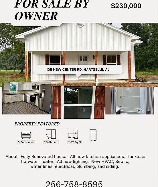 Beautifully remodeled 3 bedroom home with one bath. Minutes away from I 65 in Hartselle, AL. NEW flooring, windows, siding, HVAC, septic, plumbing, water lines, kitchen appliances, and lighting.