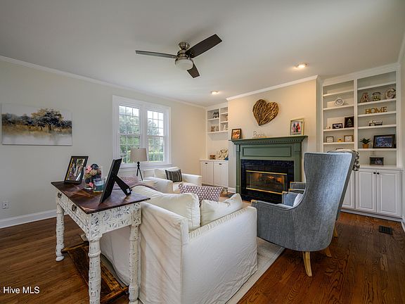 Nestled in the sought-after Hunters Ridge subdivision, just a stone's throw from the charm and culture of Historic Downtown New Bern, 105 Pebblebrook Drive invites you to experience the perfect blend of modern elegance and everyday comfort. From the moment you arrive, the inviting rocking chair front porch sets the tone for a home that's equal parts stylish and welcoming. Enter inside to gleaming hardwood floors that flow from the foyer into a formal dining room, enhanced by chair rail detailing and updated lighting—perfect for hosting memorable dinners. The heart of the home is the stunning updated kitchen, a chef's delight with tile flooring, quartz countertops, a chic tile backsplash, stainless steel appliances, an island for meal prep, and even a separate workstation for tackling your to-do list. The open-concept design effortlessly connects the kitchen to the living room, where built-ins flank a cozy gas log fireplace, creating an ideal space for gathering with friends and family. Retreat to the spacious first-floor primary suite, a sanctuary featuring a tray ceiling, a walk-in closet, and a recently updated en suite bath with a dual sink vanity, a luxurious walk-in shower, and elegant tile flooring. Upstairs, discover two generously sized guest rooms, a versatile bonus room, and a dedicated office space—perfect for remote work, hobbies, or play.