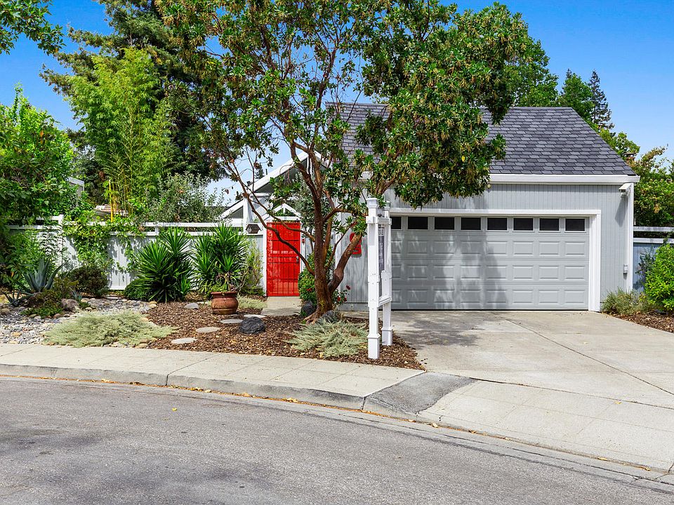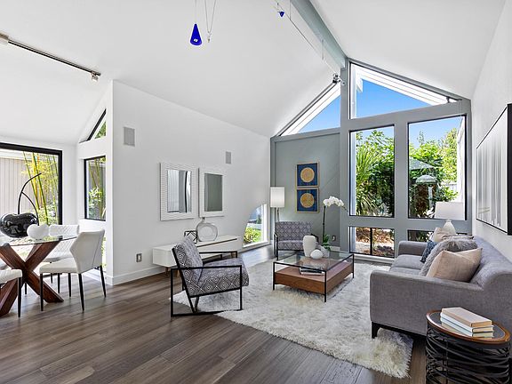 Video : Http://105Promethean.com Gorgeous updated single story home. Dramatic high ceilings, lots of large windows throughout and natural light. Open floor plan and kitchen with breakfast bar. Take in the view from the large window in the kitchen. New quartz counter top, backsplash and sink. Spacious private backyard with large bluestone patio, perfect for entertaining. New high end bamboo floor throughout. Bathrooms remodeled in 2019 with modern fixtures. Professionally landscaped front and back, with a pond, vegetable garden, towering redwood and apple, orange, lemon, fig, guava, pomegranate, kumquat trees and grape vine. Two car garage with storage loft and a long driveway. This home sits at the end of a quiet tree lined cul-de-sac. Gigabit fiber internet. Short walk to Stevens Creek trail, downtown Mountain View, Caltrain, VTA. Near major freeways.