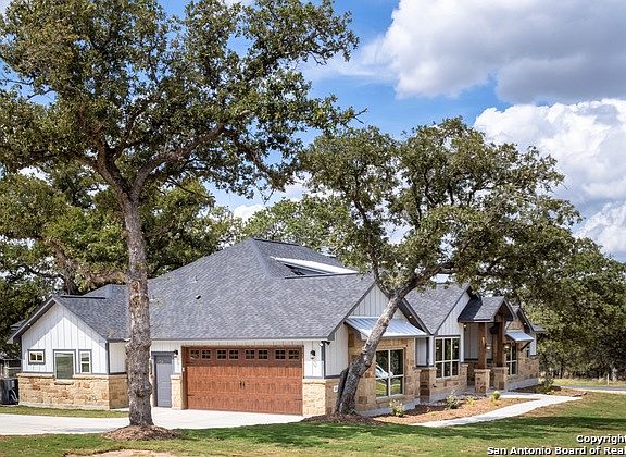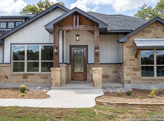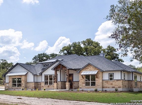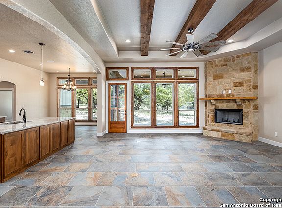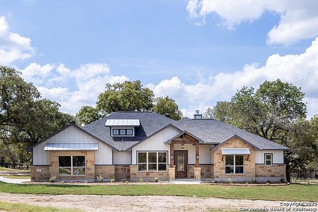 You are invited to experience this Exceptional Country Estate boasting Rustic Elegance with Texas Style & Flair. Ideally situated on beautifully wooded 1.2 country acres: Relax, Play, Entertain under the grand Heritage Oaks! You'll find thoughtful attention to these lifestyle details: *Extraordinary warmth of the lodge-style ambiance *Locally hewn mesquite fireplace mantel *Dramatically beamed master and expansive, luxurious master bath *Each & Every Bedroom outfitted with direct bath access, including: *an ideal guest or 'mother-in-law arrangement with private bath *Jack&Jill bath between bedrooms 3&4. Of course, the guest half bath makes for your entertaining ease. Study/Office has closet; possible 5th bedroom! Cool tile&wood-tile floors flow throughout, and craftsmanship is evident in the rich, soaring beamed ceilings, while patio relaxation is a breeze when viewing the extraordinary oak trees in your backyard. Find this beautiful home a mere 30 minute drive from the San Antonio metroplex: Come, enjoy the city convenience from the quiet Texas countryside! Underground Utilities including Fiber Internet!