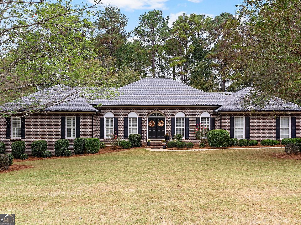 This beautifully designed brick ranch blends timeless finishes with modern comfort. Gorgeous oak hardwood flooring runs throughout the main living areas, while the sunroom offers durable LVP perfect for everyday living. The open kitchen features granite countertops, stainless steel appliances, a breakfast bar, and a built-in desk area, complemented by a formal dining room for gatherings. The living room showcases trey ceilings and a cozy gas-log fireplace, opening to the sunroom filled with natural light. A private office just off the foyer adds flexibility for work or study. Practical features include a tiled half bath off the garage entry and a separate laundry room. Three spacious bedrooms include an oversized primary suite with trey ceilings, a luxurious bath with soaking tub, tiled shower, and double vanities. Property also includes a grilling deck, unfinished storage space under the home, two car garage and alarm system. Large private wooded backyard and level front yard. Invisible Fence Optional membership to Ashford Pool at $500 per year.
