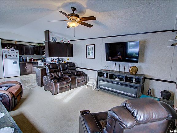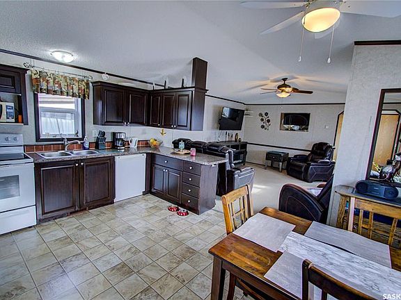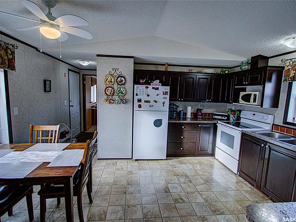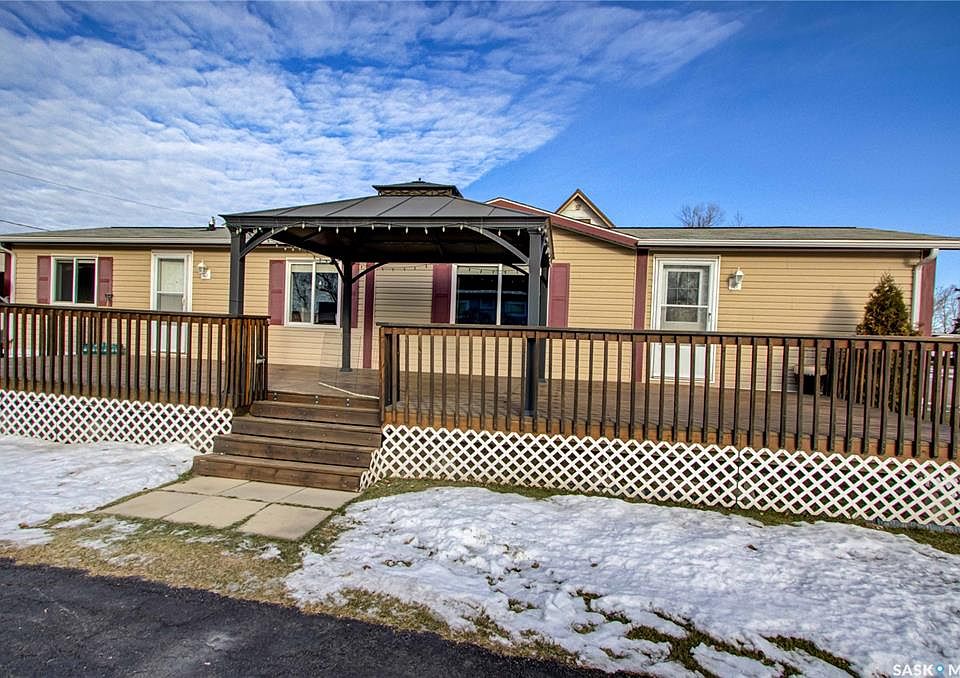 Welcome to Kinistino! This well-kept 970 sq ft modular home (built in 2010) offers affordable, comfortable living in a quiet and friendly community. With 2 bedrooms and 2 bathrooms, this home is an ideal fit for first-time buyers, retirees, or anyone seeking low-maintenance living on a peaceful dead-end street. Step inside to find a bright, clean, and meticulously maintained interior. Fridge and stove new in 2024, dishwasher and dryer in 2020. The functional layout provides great flow, ample natural light, and comfortable living spaces. Outside, enjoy summer evenings on the large west-facing 500 sq ft deck, complete with a gazebo—perfect for relaxing and entertaining. A 588 sq ft Quonset-style detached garage provides sheltered parking or a spacious workshop area. The paved driveway offers plenty of additional parking, while back alley access allows room to park an RV, boat, or other toys with ease. Located in the quiet community of Kinistino, known for its agricultural roots and home to several farm equipment dealerships, this town offers excellent local amenities including a K–12 school, gas station, grocery store, nursing home, health clinic, hockey rink, and more. Conveniently situated on Highway 3 between Melfort and Prince Albert, commuting is simple. If you're looking for comfort, convenience, and small-town charm, this property is ready to welcome you home.