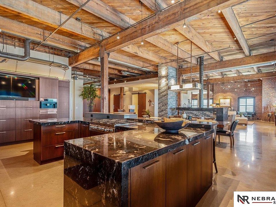 Welcome to luxury in the heart of Downtown Omaha, more vibrant than ever. Penthouse 805 designed with entertaining in mind. Polished concrete & walnut floors, original brick walls & custom shutters. Gourmet kitchen boasting walnut Eurowood cabinets with exotic wenge veneer accents, titanium granite countertops imported from Italy, Miele appliances including an oversized refrigerator with custom panel doors, an espresso maker & Dacor professional range. Fireplace crafted of polished concrete & quartzite tiles. Wet bar with nickel hammered sink & multi-temp wine chiller. Spacious master bedroom with Arrowroot wall coverings, floor-to-ceiling sliding walnut doors. Master bath with spa tub, dual basalt sinks, blue shellstone vanity countertop, floor-to-ceiling tile, large walk-in closet with stackable washer/dryer. Guest suite/Office with pull-out murphy bed & ¾ guest bath with floor-to-ceiling glass tile. Includes 3 indoor parking, 1 storage. Beautiful building with great amenities!