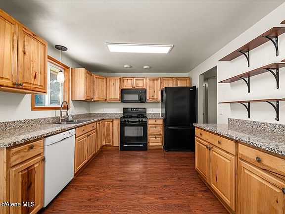 Beautiful 4 bedroom, 3 bath split level home in the heart of Post Falls, perfectly situated near restaurants, the public beach, river access, and scenic walking trails. With 2,035 sq. ft. of living space, this home offers a versatile layout designed for comfort and privacy. The main level features a bright living area with a cozy wood burning fireplace, a functional kitchen that opens directly to the back deck, perfect for indoor outdoor living, and two bedrooms including the primary suite. Downstairs you will find two additional bedrooms, a spacious family room, and a second wood burning fireplace, making it a perfect retreat for movie nights or gatherings. A small kitchenette adds extra convenience for guests or multi generational living. Enjoy the outdoors with large mature trees providing shade and beauty, plus recent updates like fresh exterior paint and a newer roof for peace of mind.