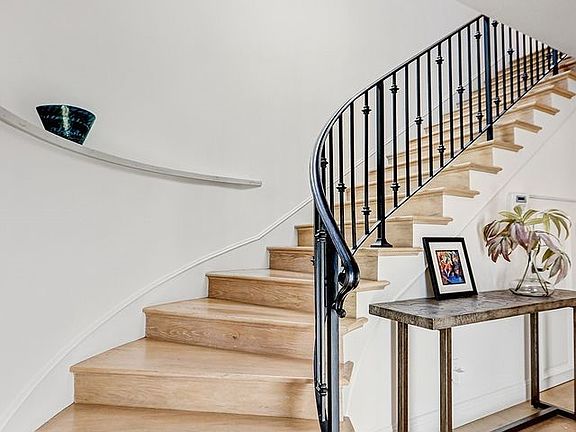 The upper level welcomes you into an expansive great room where vaulted ceilings, wide-plank oak flooring, and an abundance of natural light create an open, airy atmosphere. A spacious tiled deck—complete with a built-in gas line—extends seamlessly from the living area, ideal for indoor-outdoor living. The chef’s kitchen features Quartz countertops, high-end Wolf and Sub-Zero appliances, custom cabinetry, and a large center island with bar seating. A granite-faced fireplace serves as a cozy focal point in the adjacent living and dining areas.