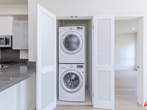 A contemporary oasis featuring sleek wood flooring, fresh paint, and elegant recessed lighting, this top-floor northeast corner unit offers high ceilings and breathtaking panoramic views of the DTLA skyline and Hollywood Hills. With no shared walls, it ensures unmatched privacy. The end unit also provides generous extra storage conveniently located right next to the residence and a bright, open layout.The modern kitchen boasts white cabinetry, stainless steel appliances, a gas range, bar seating, and abundant counter space. It seamlessly connects to the dining area and living room, which opens to a private balcony through a glass doorperfect for enjoying the views of palm trees and L.A.Built in 2017, Mari Villa offers two dedicated gated parking spaces equipped with a private EV charger connected to the unit's individual meter. Side By Side Parking. The charger is compatible with both NACS (Tesla) and standard non-Tesla connection incredibly valuable and rare feature in Koreatown, making it a huge asset for any EV owner. Water, gas, and electricity are all individually metered, giving residents full control over their utilities. The building also provides access to eight gated guest spots, and the HOA covers cable TV, high-speed internet, nightly security, trash, and building maintenance for a worry-free lifestyle. Ideally situated just minutes from Larchmont Village, Hancock Park, Hollywood, Downtown LA, and only a short drive to the 101 freeway, this refined residence embodies sophisticated living in the heart of Koreatown.