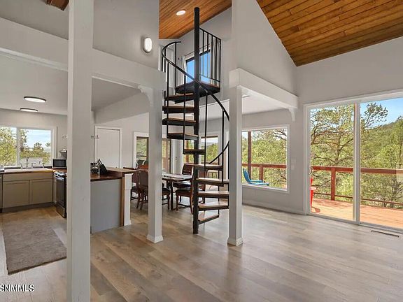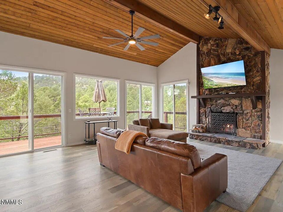 This newly renovated cabin offers the peace and tranquility you desire, only minutes from downtown and just 6 miles from Inn of the Mountain Gods. The main floor offers wall to wall windows and sliding doors that create a feeling of being in the tree tops. This unique property features a fully equipped kitchen with electric range,and dishwasher. The living room is bright and open with three 8 foot sliding doors that open onto the spacious middle deck, the tongue and groove ceiling and floor to ceiling stone fireplace, create that charming Ruidoso mountain vibe you've been looking for. This cabin features laminate plank flooring throughout- no carpet! Downstairs you will find three bedrooms and two full baths. The primary bedroom offers an ensuite bath and lower deck access through the sliding patio doors where you can grab a towel and take a dip in the six person hot tub. Amazing views, awesome location and tons of updates. This one won't last! Call to view! Owner/Brokers Home to be sold fully furnished.