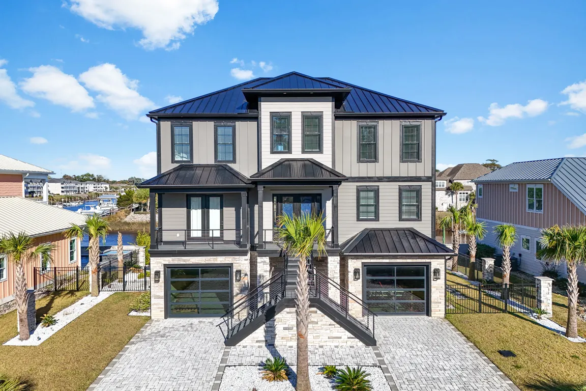 Private interior elevatorStone exteriorOpen-concept flowModern metal roofDeep-water accessHigh-end stainless-steel appliancesQuartz countertops