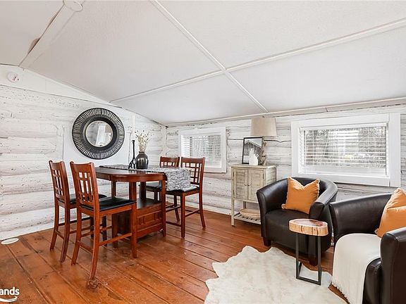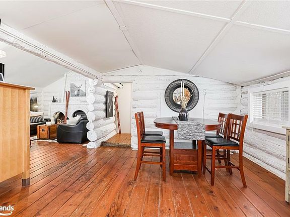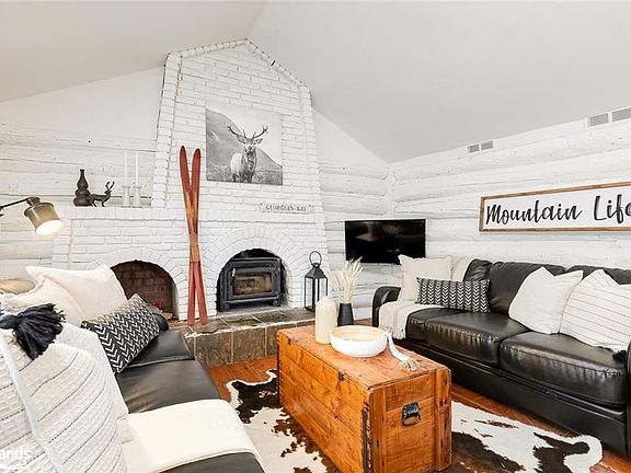 Walk to the North Chair Lift at Blue Mountain Resort. This charming 2-bedroom, 1-bathroom log retreat offers the perfect blend of convenience and tranquility, just a leisurely stroll away from the chairlifts at Blue Mountain Resort. Tucked away in a serene, tree-lined community, this chalet invites you to unwind amidst stunning views of the majestic mountain scenery. Step inside to discover a cozy yet spacious interior, where a welcoming foyer provides ample storage for your outdoor gear before leading into the inviting open-concept living, dining, and kitchen area. The main floor boasts effortless living with the primary bedroom conveniently located just steps away from the well-appointed four-piece bathroom. Embrace the warmth of the wood-burning fireplace and the charm of ski-themed decor that exudes the authentic ambiance of Blue Mountain living. The kitchen, complete with a large island, offers a perfect space for culinary adventures or casual gatherings. Upstairs, a cozy bedroom awaits, furnished with two single beds, providing comfortable accommodation for guests or family members. Modern comforts abound with a brand-new furnace and A/C installed in 2022, ensuring year-round comfort and convenience. Additional features enhance the allure of this mountain retreat, including high-speed internet and advanced home monitoring capabilities, complete with remote video cameras and the ability to lock/unlock the door from afar. Seamlessly transition into the Blue Mountain lifestyle with the option to continue these services for a nominal fee of $130 per month or customize according to your preferences. Experience the epitome of Blue Mountain charm and convenience with this idyllic log chalet – a perfect retreat for those seeking adventure, relaxation, and the beauty of nature, all within reach of world-class amenities. Don't miss the opportunity to make this your own sanctuary amidst the breathtaking backdrop of Blue Mountain.