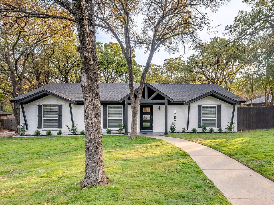 Move-in ready and beautifully remodeled, this 4-bed, 3-bath home blends modern finishes with a flexible layout perfect for today’s living. An open concept great room centers on a sleek double-sided electric fireplace and flows to a chef’s kitchen featuring a large island, quartz countertops, glass-front cabinets, tile backsplash, SS range, dishwasher, and microwave. Thoughtful floor plan includes TWO private suite options (ideal for multi-gen, guests, or home office), plus stylish spa-like baths with frameless glass showers and updated lighting. Durable wood-look flooring, fresh paint, and wide-open sightlines make entertaining effortless. Outside, enjoy a large, treed backyard with storage shed and plenty of room to play, garden, or add a pergola. All this in a quiet, established neighborhood with quick access to DFW Airport, AA HQ, major employers, shopping, and dining. Welcome home!