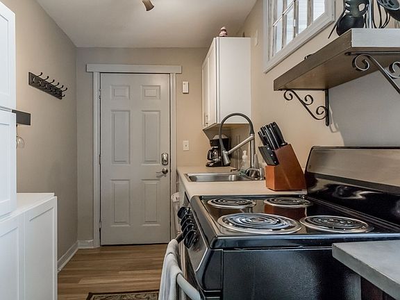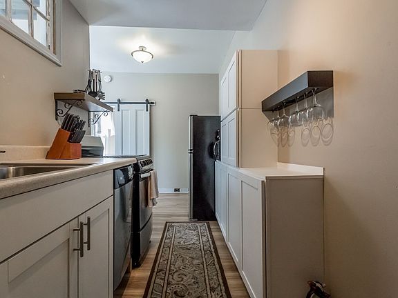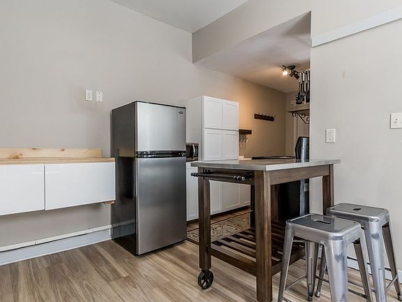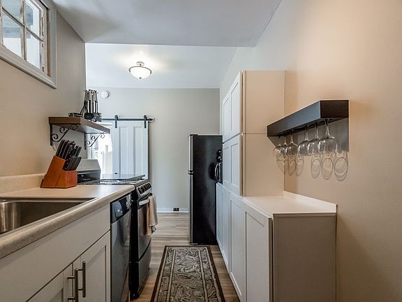 Kitchen: Fully furnished, featuring white cabinetry and open shelving, pantry and ample counter space including coffee station and mini-wine bar. Stainless appliances include apartment-sized fridge, 4 burner stove, 18-inch dishwasher and microwave. Includes coffee maker, toaster and iron plus dishes, cookware, utensils, glasses and cups. High-top breakfast bar can also serve as a laptop desk, provides additional prep space and seats two facing the flat screen TV.