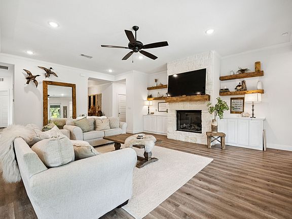 Stunning stone fireplaceModern cohesive aestheticDesigner finishesRefined comfortPrivate retreatStunning one-storyThoughtful craftsmanship