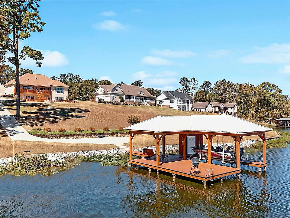 Rare deep water Lakefront is coming soon to Waters Edge. Immense Living space in this Custom Build, expansive Lake views, 14'+/- water depth off the custom Boathouse- complete with lifts, storage, swim pier, unique fishing trap door plus fish feeder. Main-level lake view Master Suite, finished daylight Basement with an In-law Suite, Ideal for entertaining or multi-generational living. Two Kitchens, two Living areas, large main-level island Kitchen, double pantry, Open Living/Dining/Kitchen with wall of windows that exit to a fantastic main-level deck with a bonus lower-level large Patio. Includes storm cellar, climate-controlled Workshop & exceptional storage space. Premium finishes throughout include LVP flooring, granite countertops, natural gas, and fiber internet. Fenced portion around Patio, additional parking, boat parking, circle drive & concrete drive to the water with Lakeside sitting area near dock. Year-round water, located minutes from Pursell/FarmLinks Golf Resort.