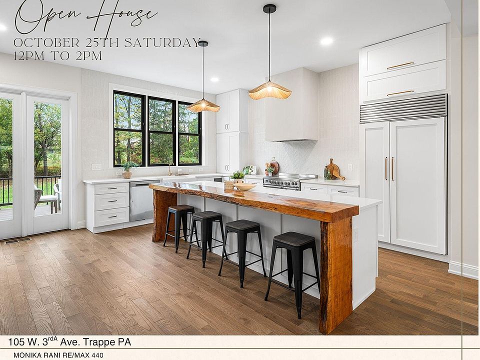 **Open House Saturday 12-2**Discover 105 W. 3rd Ave — a new home with modern design, high-end finishes, and small-town charm. Enjoy parks, trails, and Main Street all within half a mile, plus top-rated schools — move in before the holidays! EXTERIOR FEATURES: From the moment you arrive, the home’s striking curb appeal captures attention. The exterior showcases James Hardie Board and Batten siding, accented by a real stone wall on the front porch. A metal roof with pine tongue-and-groove ceiling adds warmth and architectural detail, while grand double front doors create an inviting entryway filled with natural light. The home features Andersen black-trim casement windows throughout, designed for energy efficiency and timeless style. A composite rear deck overlooks the expansive .75-acre flat lot, bordered by mature trees that provide privacy and a peaceful backdrop. The oversized two-car garage is fully finished with recessed lighting, windows, and insulation. It includes front driveway access, a rear service door leading to the backyard, and custom-designed sleek black 8-foot garage doors that complete the modern house aesthetic. INTERIOR FEATURES: Every detail inside this home showcases luxury and precision craftsmanship. SOLID hardwood floors extend throughout, complemented by 10-foot ceilings and cathedral-style heights in the foyer and living room. The home’s architectural arches and extra-large windows frame the space with balance and light. All interior doors are 8-foot solid core designs, and every window and baseboard features solid wood trim work for a cohesive, custom-built finish. Dual high-efficiency HVAC systems ensure year-round comfort and energy savings. Each bathroom is equipped with a Bluetooth speaker and an exhaust fan. FIRST FLOOR: The main level offers an open, elegant layout perfect for both entertaining and everyday living. A designer gas fireplace with arched custom shelving anchors the living room, while a built-in arched coffee bar niche adds charm and convenience. The chef’s kitchen is a showpiece of style and function, featuring premium cabinetry, custom-cut quartz countertops, a farmhouse sink, and Siteline sliding glass patio doors opening to the rear composite deck. Oversized windows flood the space with natural light and provide beautiful views of the backyard. A stylish mudroom and laundry room feature custom shelving, wallpaper, and a large window overlooking the backyard. The first-floor BEDROOM offers flexibility for guests or multi-generational living and is paired with a full bathroom featuring floor-to-ceiling tilework and high-end fixtures. Second Floor Upstairs, the primary suite is a true retreat—featuring a dramatic cathedral ceiling, custom-designed walk-in closet, and a spa-inspired bathroom with quartz vanities, luxury tilework, and designer lighting. Each secondary bedroom includes a ceiling fan and Bluetooth-integrated exhaust fan systems in the bathrooms, blending modern convenience with comfort. The second floor continues the home’s cohesive design with matching solid trim details, 8-foot doors, and premium finishes throughout. JUST minutes from Trappe and Collegeville downtown shopping, dining, and easy access to major routes, this one-of-a-kind new construction home offers the rare opportunity to own a property where elegance meets everyday livability.