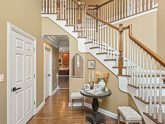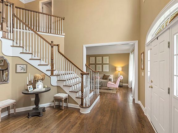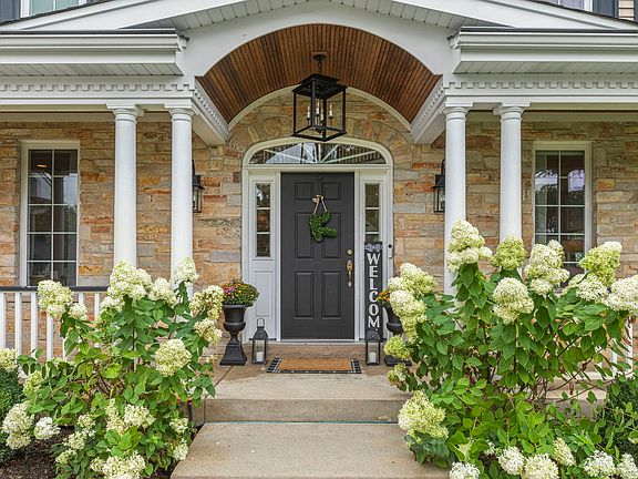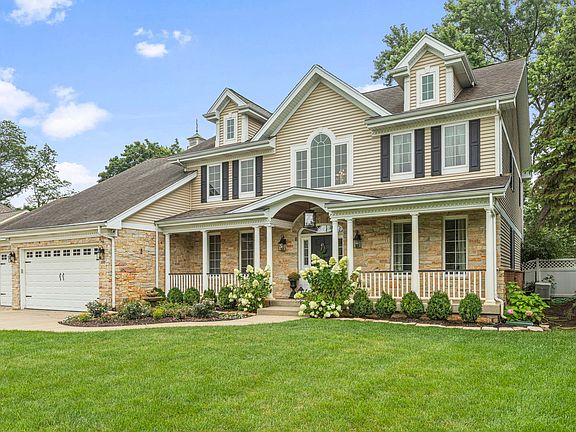 Welcome to this expansive and beautifully designed home offering the ideal layout for today's lifestyle-all set on a fully fenced, half-acre lot with lush landscaping and a serene, park-like setting. Step onto the charming covered front porch and enter the grand two-story foyer, featuring a dramatic curved staircase, striking light fixture, and rich dark-stained hardwood floors that flow throughout the main and second levels. To the left, French doors open to a private first-floor office-perfect for remote work. To the right, a light-filled formal living room showcases crown molding and tall windows, seamlessly flowing into the elegant dining room with tray ceiling, custom millwork, wainscoting, and a modern chandelier with medallion detailing. The heart of the home is a stunning open-concept kitchen and family room designed for both everyday living and effortless entertaining. The kitchen boasts warm cabinetry, light countertops, stainless steel appliances, planning desk, and both a center island and peninsula for ample seating. A spacious eating area opens through sliding doors to the backyard's expansive paver patio, creating the perfect indoor/outdoor flow. The step-down family room impresses with its vaulted A-frame ceiling, cozy gas fireplace with TV above, and custom built-in shelving. A rare main-level full bathroom, along with a large mud/laundry room featuring abundant storage and access to the heated 3-car garage, complete the first floor. Upstairs, you'll find four spacious bedrooms and two full bathrooms. The luxurious primary suite includes a vaulted ceiling with stylish light fixture, wall of built-ins, dual walk-in closets, and a spa-like en-suite bath with whirlpool tub, double vanities, and separate shower. The additional bedrooms share a full hall bath with a double-sink vanity and tub/shower. The finished basement offers incredible bonus living space with something for everyone: a game room, home theater with projector screen, large exercise room, and a convenient half bath. Outside, the backyard is a true retreat-fully fenced with white PVC privacy fencing, mature landscaping, large paver patio with multiple seating areas, and a storage shed. This is a rare opportunity to own a custom-built home on a generous lot, offering space, functionality, and timeless style in a setting you'll love to come home to.