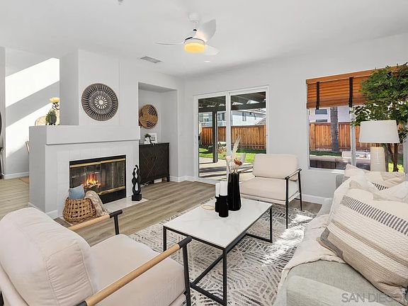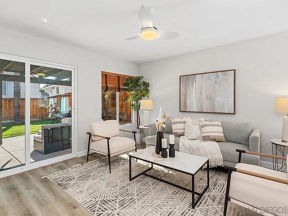 Welcome home to a stunning remodeled 4-bedroom home in the sought after and rarely available community of Mission Creek community, in the Carlton Hill area of Santee. Complete with a fully owned solar system, this home has been almost entirely remodeled, including gorgeous brand-new sweeping luxury vinyl plank flooring through the living areas and all new carpets through bedrooms. The open plan eat in kitchen features all new white shaker kitchen cabinets with the oil rubbed bronze fixtures and gleaming new white quartz stone counter tops, giving the home a modern farmhouse feeling. The property boasts a spacious floor plan with vaulted ceilings and beautiful accent windows in the living and dining rooms, with a separate family room and cozy fireplace. Primary suite includes a remodeled bathroom with a beautiful dual vanity and high-end custom tile shower and a convenient separate w/c. This home features a peaceful private backyard with full fencing and a large, covered patio with mature trees. Just walking distance to neighborhood community pool and park, across the street from shopping, dining, Santee Sportsplex, and schools!