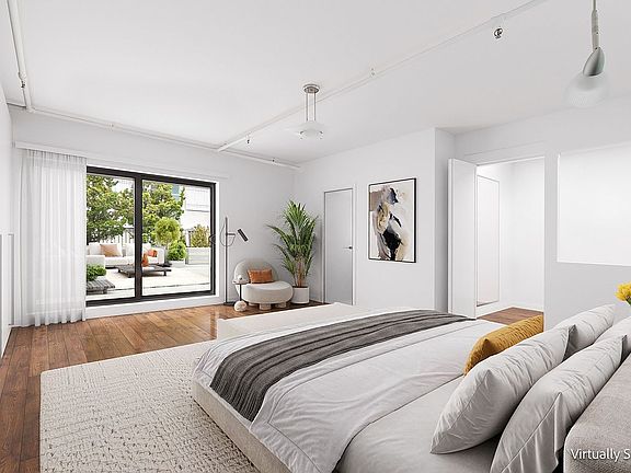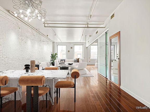 Second bath and a sizable bedroom/office , separated from the living room by a intricate glass sliding door, completes the main floor. A white brick wall adds just the needed touch to give it a stylish Soho look.