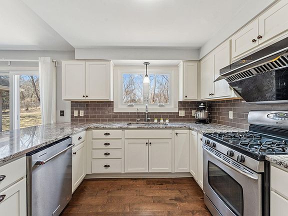 Bright, open show stopper on just under an acre of tree-filled land in the sought-after, award-winning Wayzata School District. This light-filled home features four bedrooms on one level and nearly all windows are less than five years old, including brand-new Pella windows throughout the main-level family room. The primary suite includes a renovated bathroom with a soaking tub and a spacious walk-in closet. Updates include newer upstairs carpet, furnace, A/C, washer, dryer, and range/oven. The newly renovated living room features a dry bar, built-in fridge, and electric fireplace. The open kitchen has also been updated with a built-in breakfast nook, granite countertops, gas range, imported statement hood vent, and a built-in pantry. The large family room showcases a wood-burning fireplace, vaulted ceilings, exposed beams, and skylights. Main floor laundry, abundant space, and privacy throughout. Outside, enjoy the expansive tree-surrounded lot with a fenced backyard and a large deck ideal for entertaining!