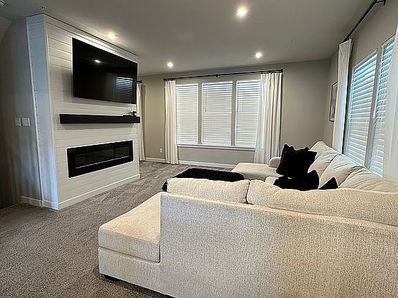 * Custom shiplap accent wall with electric fireplace