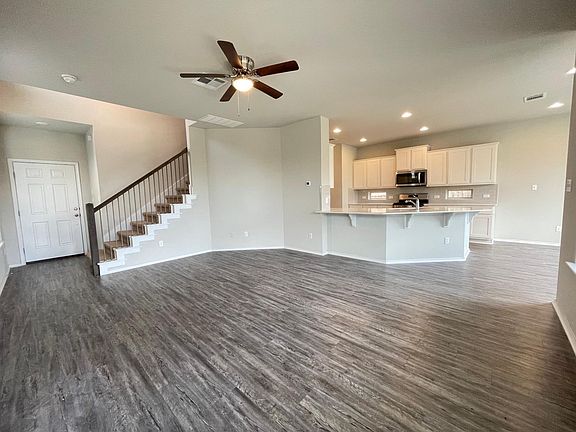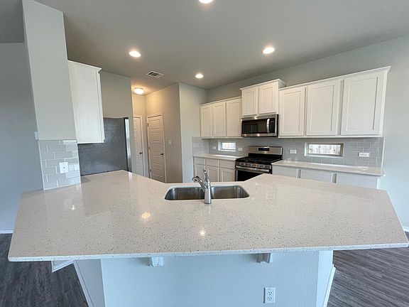 Beautiful 2 story Round Rock home! This home features a wonderful open floorplan on the main level including the kitchen, living, and dining spaces. Perfect for entertaining! The kitchen is fully equipped with an extra large peninsula, quartz countertops, and stainless steel appliances. The upper level includes all 3 bedrooms. The master bedroom is complete with an en-suite bathroom featuring a walk-in glass enclosed shower, dual vanity, and a huge walk-in closet! The private backyard is a real treat! It has a covered patio overlooking a beautiful green lawn! Easy access to I-35, 130 tolls, and commute to major employers. Close to Kalahari Resort & Dell Diamond.