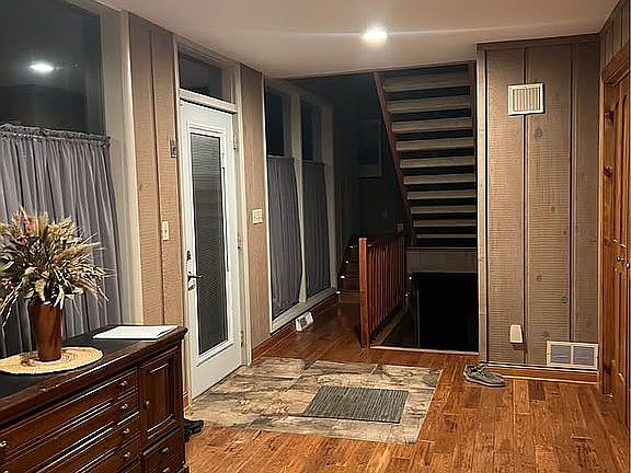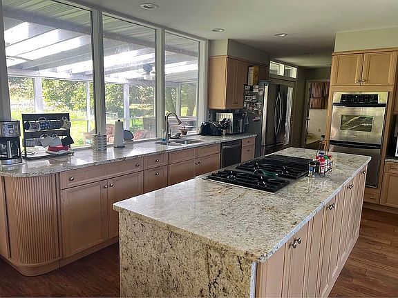 Beautiful Frank Lloyd Wright inspired style house. Sits on 6.14 Acres with a 5/8 acre pond (stocked) Hardwood floors throughout. Granite countertops throughout. Fireplace in great room. Fresh exterior paint job. Leaf proof gutters. All new furnaces and air conditioning three years old. Outdoor wood burning boiler. 21 solar panels. New well last year. This house has an in-laws quarters attached.