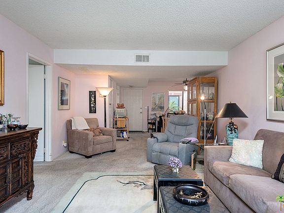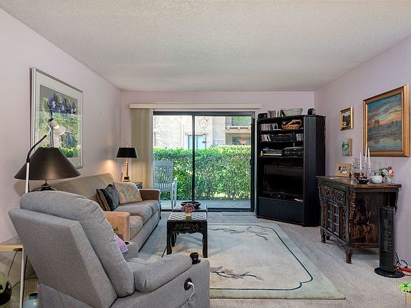 Great Central Palm Springs Location. Enjoy the convenience of walking to nearby shopping center, Starbucks and downtown Palm Springs - packed with energy, excitement, restaurants, shopping and social establishments. Ramon Estados is a gated resort-like community with 2 swimming pools, 2 spas, lighted tennis courts, pickle ball courts, recreational room, fitness area, sauna, manicured grounds and updated on-site community laundry. One assigned covered parking space and nearby guest parking. This lower-level unit is the largest 2br/2ba floorplan. The private patio adjacent to living room has a secure storage room and nice mountain view. Excellent separation of bedrooms provides for privacy. Unit needs new floor coverings, paint, kitchen & bath updating. One pet permitted and 30-day minimum rental. HOA includes hot/cold water & trash.