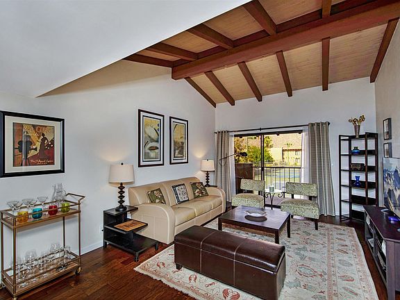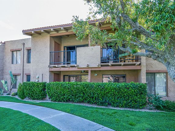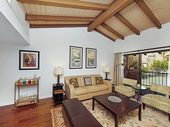 Location! Location! Location! Beautiful wood floors. Ceramic tile in the kitchen. Galley kitchen with slab granite counters and matching black appliances. Living room and 2 Master bedrooms with wood-beamed vaulted ceilings. Spacious ensuite bedrooms with walk-in closets. Amazing San Jacinto Mountain views from the living room, balcony and both bedrooms.
