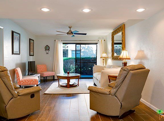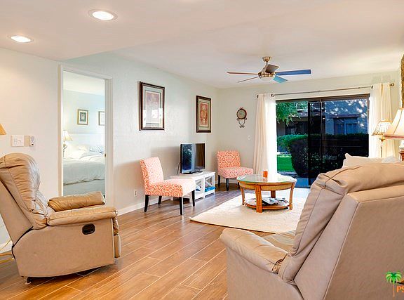 Nestled in Central Palm Springs and within walking distance to Downtown is Ramon Estados!! This verdant, resort-like complex is the perfect escape from city life! This condo is a 2 bedroom / 2 bathroom retreat with brand new flooring and some lite cosmetic updates. The Kitchen is large with plenty of storage and opens to the dining area. The home features two master suites that are split from each other for optimum privacy. The patio is shaded and overlooks the green belt so that you can walk out the patio and jump in the pool or spa! The complex also features 2 pools and spas, as well as pickle ball and tennis courts. The gym and sauna are located in the Community center with fully stocked game room!