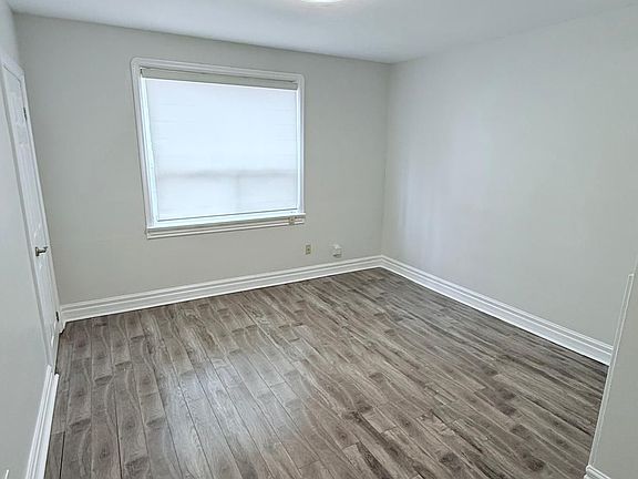 Beautiful new flooringContemporary kitchenSleek white cabinetryStainless steel appliancesCharming eating areaSparkling crystal chandelierComfortable family room