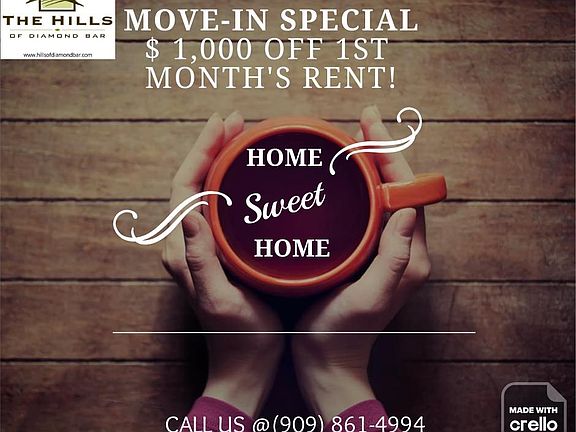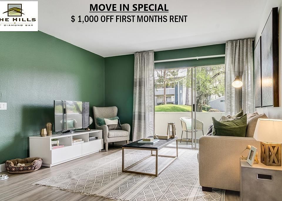 AVAILABLE NOW! MOVE-IN SPECIAL $ 1,000 OFF 1st MONTH'S RENT! WE'RE OPEN MONDAY THRU FRIDAY 8AM TO 5PM AND SATURDAYS 10AM TO 5PM. Or visit us at: HILLS OF DIAMOND BAR 1020 S. GRAND AVE. DIAMOND BAR, CA 91765 $ 500 Deposit OAC Discover the upbeat lifestyle of the Hills of Diamond Bar Apartments and join us in sunny California for a lifestyle of comfort and convenience. Outfitted with all the creature comforts you desire, our Diamond Bar apartments are one of the best places in town to call your own. Offering a curated collection of two bedroom apartments, our floor plans have something for everyone. Inside each one of them, you'll find wonderful features, all meant to make your daily life easy and stress-free. These include ceiling fans, in-home washer and dryers, stainless steel appliances, wood style flooring, a pet-friendly environment for your furry friends, as well as many other perks. For an extra ounce of comfort, you can splurge on of our newly renovated units with quartz countertops and interior designer finishes. Outside the door of your home, you'll find a true oasis of relaxation. An outdoor fire pit & BBQ area, a high-speed Wi-Fi lounge, and a new urban retreat clubhouse are just some highlights of our community. On torrid days, dip your toes in the sparkling swimming pool and unwind at the spa or spoil your pet with thorough grooming at the Pup Suds pet washing station. Close to the Diamond Bar Golf Course, Sycamore Canyon Park, and only minutes away from the Diamond Bar Town Center and many more local attractions, our Grand Avenue address is perhaps one of our best amenities. But don't take our word for it, browse through our pictures or better yet give us a call and schedule a tour to see for yourself! J.M. zillow 1 year lease Deposit $ 500.00