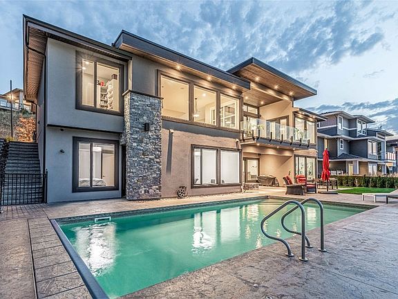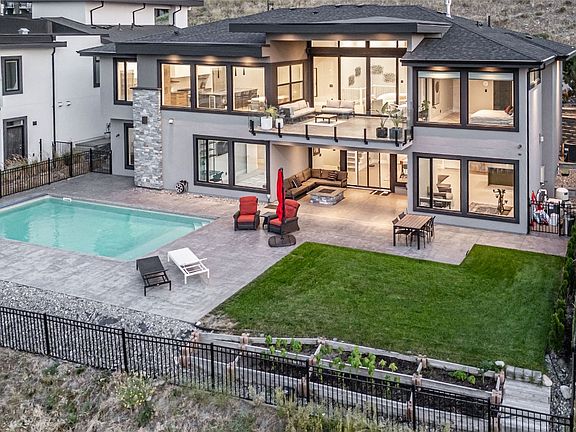 Welcome to this stunning Modern Mountainside walk out rancher that perfectly blends luxury and comfort. Perched above the valley and lake, the home captures breathtaking views through oversized windows and doors, filling every space with natural light. As you walk through the front door you are immediately drawn to the expansive view and the over sized covered front balcony, perfect for taking in the entire Lake and Valley Views. The chef’s kitchen boasts top-of-the-line appliances, while soaring ceilings create an airy elegance throughout the main level. The primary suite is a private retreat with a full spa-like ensuite, complete with a soaker tub, steam shower, and direct access to the deck. The lower level is designed for entertaining with three large bedrooms, one which is also set up as a theatre room, two full baths (including pool access), wet bar, fireplace, and a spacious games and living area. Expansive covered outdoor spaces and a 16x32 ft saltwater pool with auto-cover invite year-round enjoyment. Pre-wired for Hot tub. A 3-bay garage adds functionality, while the location offers unmatched convenience close to schools, trails, and shopping. This home is a rare opportunity to experience elevated living with comfort, privacy, and endless views. Measurements are approximate.