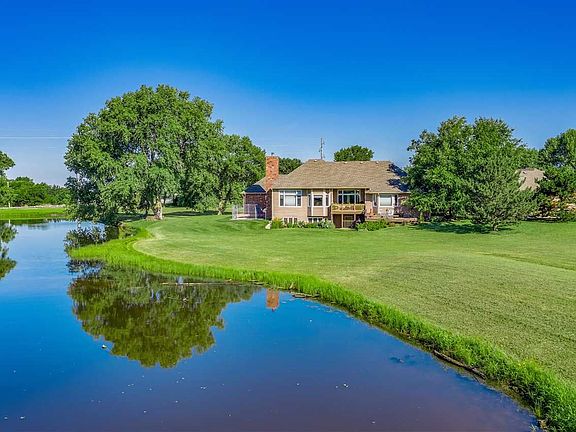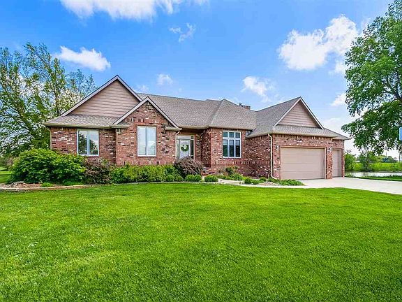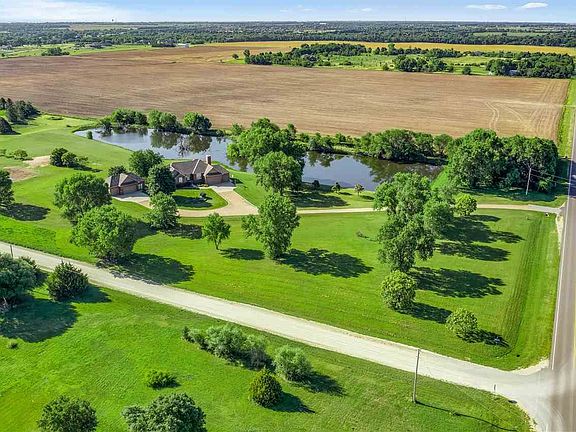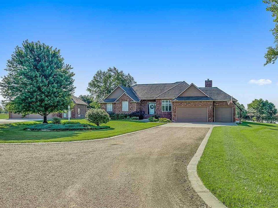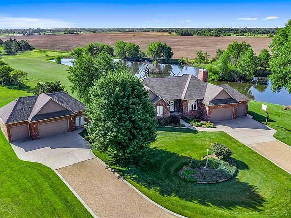 Don't Miss this Rare Find! Private and Serene Country Living! 3500sq ft home with 6+ car garage tucked in the middle of a lovely 10 acre wooded lot with almost 2 acre pond! Located in Goddard, Kansas only a 5 minute drive to Wichita, this one owner, beautiful 3/4 brick ranch home estate is phenomenal! Imagine family and friends enjoying fun recreational activities such as fishing, canoeing, four wheeling, target shooting and bird watching. The possibilities are limitless. Breathtaking expansive green grass and lake views make this the perfect setting for relaxing or entertaining. The owners have customized a Robl inspired floor plan to create your dream home! Easy and convenient layout. Excellent craftsmanship, cherry wood cabinetry, trim, baseboard and crown molding. A residence to accommodate every family style and size for sure! Total finished living areas include 5 bedrooms, 4 1/2 bathrooms, 6+ car garage (3 car attached garage plus an additional 3 car detached garage with additional living quarters). The 3 car + detached building includes a 4th full bath, nice 10x7 sauna and a 15x10 finished room which can be used as a 5th bedroom, exercise/hobby room, office or guest quarters. This area is heated and air conditioned and has space for a kitchenette. Oversized detached garage measures 32x27 and has 220 outlet with 60 amp, is fully insulated plus has another 220 hook up for hot tub at exterior. The main home has 4 bedrooms, 3 1/2 bath and will surely meet or exceed all your family needs. Tall ceilings, spacious formal and informal living/dining areas, beautiful tall windows with lake views from almost every room. Large kitchen with tall cherry cabinets, tile floors, tile backsplash, Corian counters, pull out drawers, large pantry, opens to hearth with gorgeous wood burning fireplace and informal dining area. Main floor laundry room includes added storage cabinets, wash sink and hanging area. Oversized attached 3 car garage comes complete with one entire wall of built-in work shop benches, cabinets and work space. At the opposite end of the main residence you'll find double doors leading to the fabulous owners suite. Awesome green terrain/lake views with convenient walk out to deck. Nice coffered ceiling & good sized walk-in closet. Master bath has a soothing soaker tub, seated vanity w/mirror, double vanity sinks, low maintenance onyx shower walls/glass doors plus a private toilet. The lower level was completely finished in 2003. It includes one large bedroom, a full bathroom with granite counters, tall vanity and then the highlight... an amazing family/recreation hang out with an oversized U shaped bar with fabulous granite, Alder wood cabinets, tons of seating and serving area, refrigerator & microwave. The family/recreation room measures 36x21 and includes pellet stove, wet bar and nice TV area w/built-in buffet specifically designed to conceal and store all your entertainment equipment and stereo components. Built-in ceiling surround sound speakers included. Other amenities include, security system, long private drive, underground invisible pet fence, sprinkler system with landscaped flower beds, irrigation well, two tiered wood deck, patio, concrete driveways at both garages, all appliances stay, room for a future theater room, lots of unfinished storage area in basement, walk out/view out basement, all electric efficient energy home, water softener, water back up for sump pump, (2) 50 gal water heaters, new roof and gutters 2013 & new HVAC 2008. Hurry schedule your showing today! This peaceful estate won't last!