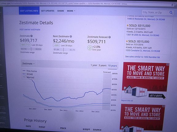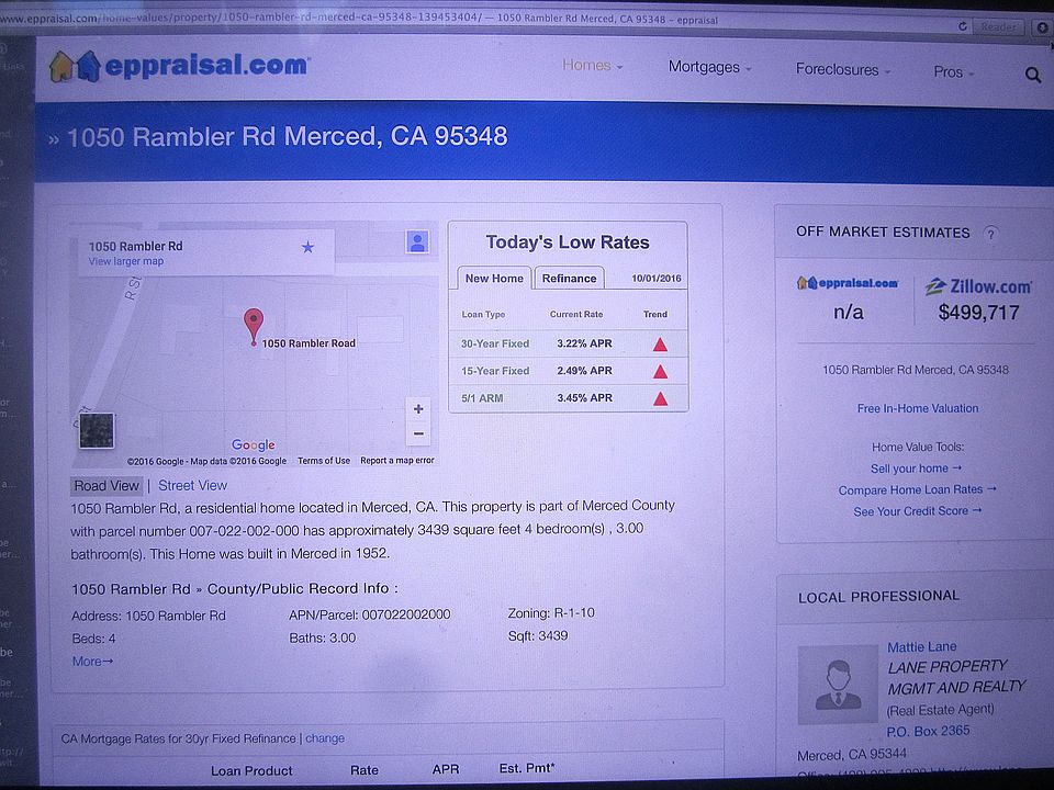 HUGE HOME WITH A 26,668 SQUARE FOOT SECLUDED LOT FOR SALE BY OWNER "AS IS" FOR $300,000 OR BEST OFFER IN ONE OF THE MOST PRESTIGIOUS NEIGHBORHOODS IN MERCED COUNTY. Call: Cy for info. (310-739-3777). ONLINE VIRTUAL TOUR OF INSIDE AND OUTSIDE OF HOME ARE AVAILABLE AT: https://youtu.be/YawE26sxC8U Face Time, Skype, or in person tours are available by appointment. FIRE DAMAGED HOME WITH GREAT POTENTIAL NEEDS EXTENSIVE REHAD/REBUILD WORK SINCE MOST EVERY THING IS DAMAGED. Rehab/rebuild the home the way you wish into your dream home. The base structure allows for an accelerated cost effective rehab/rebuild. The long driveway to backyard allows construction equipment to easily access the backyard. PRICING CALCULATION OF THE HOME (APPROXIMATE 26,668 SQ FT LOT) ESTIMATED VALUE WAS $499,717 ACCORDING TO EPPRAISAL.COM AND ZILLOW.COM ON OCTOBER 1, 2016 "NOT" TAKING INTO CONSIDERATION EXTENSIVE FIRE DAMAGE. (See said pictured Zillow estimate of home below at $499,717). Due to the fire damage, $199,717 was subtracted from $499,717 = $300,000 current selling price. Rehab/rebuild the home for less and then flip the home to make a profit in a price climbing market! (See Zillow.com pictured estimate below showing the home to increase approximately $10,000 in a year). Moreover, the $499,717 appraisal does not take into account for a brand new rehab/rebuild that should price the home WELL OVER $499,717 since the home would be in better condition. Seller is not in the home rehab business and is highly motivated to sell. INTERNET HOME REHAB ESTIMATES may be approximately $20-$30 per square foot to rehab the home. Thus, it may cost approximately $77,580 (3879 sq ft x $20) to $116,370 (3879 sq. ft. x $30) to rehab the home. Bring your contractor to get your own estimate. PROPERTY CAN BE USED AS A LARGE HOME OR A VERY LARGE RENTABLE DUPLEX: In 1978, there was a second home added on to this home originally built in 1952. There are 2 separate kitchens, 2 separate fireplaces, 2 separate front entry ways, 2 washer dryer hook-ups, 2 hot water heaters, 2 separate doors to backyard, and 2 separate living rooms. Chain link fence separates the backyard in half. This is ideal to rent EACH side out for approximately $1,150 for a total of $2,300 rent or to live in the other side or use entire home for extended family or a large family.(See Zillow picture rental estimate below) 4 BEDROOMS / 3 BATHROOMS / 15 TOTAL ROOMS IN HOME: There are 2 studios/offices that can be easily converted to bedrooms for a total of 6 potential bedrooms. Or, one studio/office can be easily converted back to the original two-car garage. There are 4 bedrooms, 3 on one side and 1 on the other side. There are 3 bathrooms, 2 on one side of the home and 1 on the other side. THIS IS "NOT" A FINANCIALLY DISTRESSED PROPERTY THAT HAS TO BE SOLD UNDER IT'S MARKET VALUE. Thus, low offers are unwelcome. **NOTE: If a second story is added on to the part of the home where the roof is already burnt off, it could quite easily be the nicest highest priced home in Merced. Sell home for a great profit because there is a shortage of upper class homes in Merced since most wealthy people don't move from those neighborhoods. Moreover, the new U.C. Merced Campus has added many affluent buyers to the community that wish to live in affluent neighborhoods. THE HUGE HOME HAS ONE OF THE LARGEST LOTS IN NEIGHBORHOOD with a huge private backyard that has enough room for a pool, basketball court, tennis court , or large parties. There are many large beautiful black walnut and redwood trees in the backyard that can be sold for a profit. Hardwood floors in part of the home. Many large windows throughout the front & back of the home makes for pleasant views and great air flow.