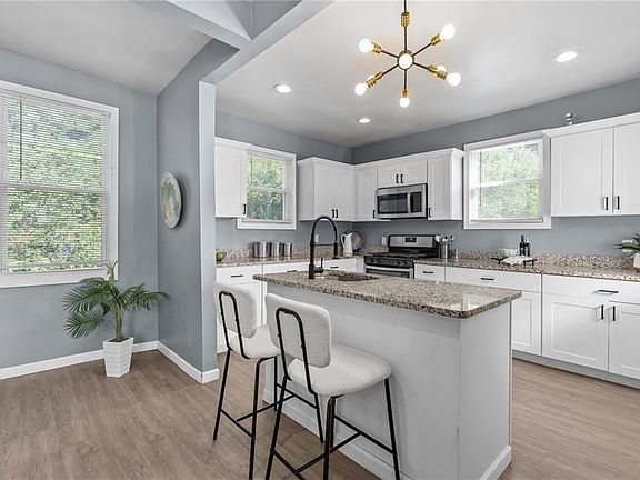 White shaker-style cabinetrySpacious backyardCustom tile workNewer flooringBright stylish kitchenStainless steel appliancesSleek granite countertops