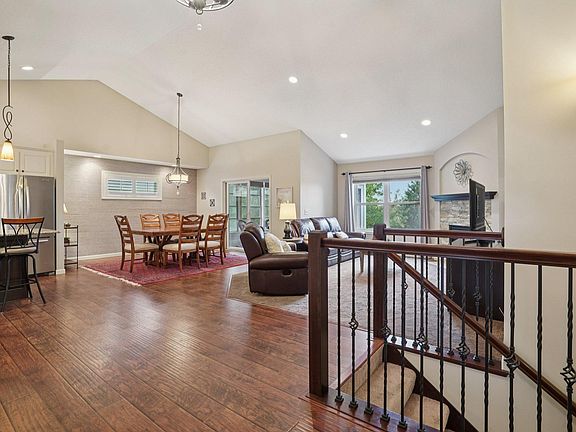 Beautifully updated home with vaulted ceilings and panoramic western views! The views are truly amazing with the home elevated above the homes to the west. Refinished oversized gourmet kitchen features white cabinetry, huge center island, pantry, beverage fridge, gas range with hood, stainless steel appliances, granite countertops, and tile backsplash. Scraped hardwood floors. Wonderful three-season porch and comfortable living room with decorative fireplace and vaulted ceiling. Very open concept with large dining area! Large primary bedroom with large private bath. Expansive walkout lower level with additional fireplace, two bedrooms, and huge storage room. Association-maintained yard and snow removal for easy living. Convenient location close to all of Woodbury's shopping, dining, and amenities! This one is exquisite!