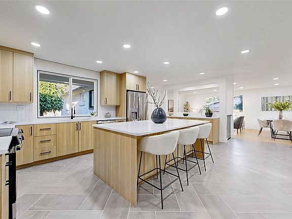 Step inside to an open-concept main level where the beautifully staged living and dining areas flow seamlessly into the show-stopping kitchen. This impressive kitchen features a massive center island, quartz countertops, sleek stainless steel appliances, and custom white oak cabinetry with abundant storage and workspace. Just off the kitchen, French doors open to a bright sunroom—perfect as a cozy retreat or flexible living space.