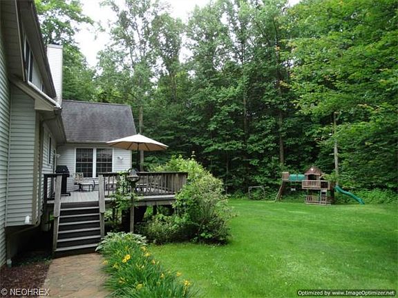 Beautifully Maintained & Spacious Colonial set back on 3 Private Wooded Acres! Over 3800 sqft of finished living space includes 4 Bedrooms, 3.5 Baths and freshly painted neutral décor throughout. Foyer Entrance with hardwood floors open to Formal Dining Room & French doors lead to 1st floor Office. Great Room with see through gas stone fireplace through to vaulted Breakfast Room/Sunroom and Kitchen with center island breakfast bar, built-in desk, ceramic floors & appliances. 1st floor Laundry Room. Master Bedroom includes walk-in closet, large Master Bath with double vanities & jetted tub. Second level also includes 3 additional spacious bedrooms plus 2 finished bonus rooms with separate entrance from garage offer many possibilities. New furnace and water softener. Full finished lower level Rec Room with full bath, storage area, garage access and walk-out to side patio. 3-car attached garage, large storage shed & paved drive. Enjoy peaceful views from covered front porch or back deck. Chardon Local Schools. Minutes to Chardon Square!