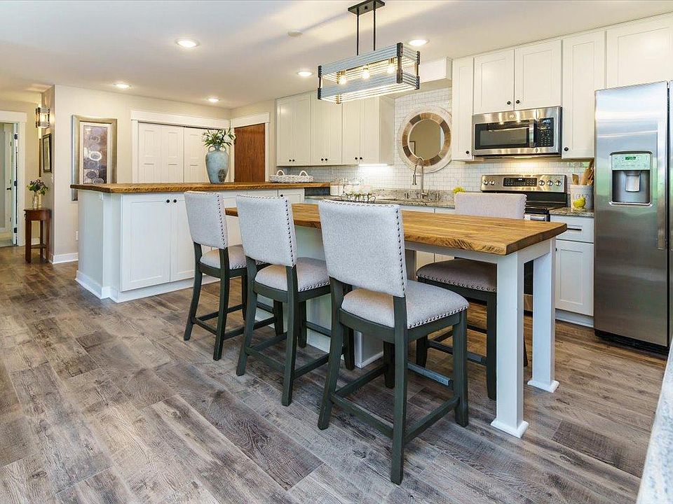 primary suite complete with a walk-in closet and a luxurious custom 3/4 bath. The open concept kitchen is a showstopper, featuring a large island with Forever Barnwood, granite countertop's, GE stainless steel appliance's-including a double oven-and soft close cabinetry. A standout feature of this unit is the in-unit laundry with high end Bosch washer/dryer, offering premium convenience. The open and bright living spaces flow seamlessly to a stunning 40 ft patio which can be accessed from both the living room