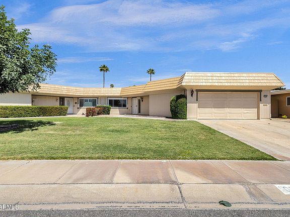 Beautifully remodeled Sun City gem with RARE oversized epoxied 2 car garage and high ceilings. This unit features a fresh, modern aesthetic with new porcelain flooring, elegant quartz countertops, white shaker cabinets, and black stainless steel appliances. Spacious bedrooms have large walk in closets and abundant light. Low maintenance yard and HOA maintains front yard and covers water. New water Heater 2025. Convenient location close to groceries, coffee shops, restaurants, and easy access to the 101 freeway. Plus, Westgate Entertainment Center is just a stone's throw away. As a resident, you'll have access to Sun City's renowned recreation centers, bowling clubs, golf courses, and community pools. Don't miss this chance to experience Sun City living at its finest