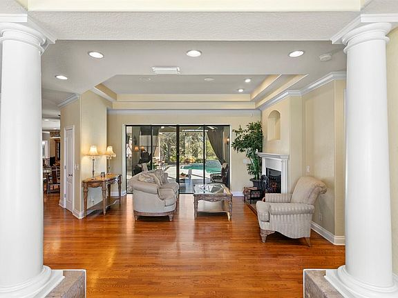 Located in the prestigious manned and guard-gated community of Cory Lake Isles, this northwest-facing, one-of-a-kind custom estate sits on an oversized homesite with private conservation views. From the moment you arrive, the curb appeal is undeniable—an impressive winding pavered driveway leads to a charming courtyard entry and stately double-door foyer. Inside, you’ll find 5 bedrooms, 5 bathrooms, a private office, and a large bonus room, all showcasing custom craftsmanship and rich finishes. The grand foyer sets the tone with soaring scale, column accents, and wood floors that flow through most of the home. The office features plantation shutters, built-ins, and elegant wood flooring, while the formal spaces impress with crown molding, a coffered ceiling, wet bar, built-in hutch, and a wood-burning dual fireplace that is featured in both the living room and primary bedroom. The primary suite is a true retreat with wood floors, and a spa-inspired bath featuring tumbled marble flooring, walk-in closet, detailed tile accents, and custom maple cabinetry. The gourmet kitchen is designed for entertaining with stainless steel appliances, double ovens, maple cabinetry, granite countertops, and an oversized island workstation. The split floor plan ensures privacy, placing the primary suite near the formal areas, two bedrooms near the kitchen and family room, and two more bedrooms toward the rear of the home. The family room highlights wood floors, custom built-ins, and pocket sliding glass doors opening to the outdoor living space. Upstairs, the oversized bonus room offers a full bath and kitchenette with refrigerator, sink, and microwave—perfect as a media room, guest quarters, or in-law suite. The outdoor oasis is extraordinary, with a full outdoor kitchen, large covered lanai, heated spa, cascading waterfall, fire pit seating area, and extended pavered patio, all surrounded by lush landscaping. Cory Lake Isles is more than a neighborhood—it’s a lifestyle. Residents enjoy a 165-acre ski lake for boating, fishing, and water sports, along with resort-style amenities including a waterfront beach club, fitness center, playgrounds, parks, tennis and pickleball courts, and a community pool. This rare estate offers luxury living inside and out, with the best of Tampa’s premier gated lakefront community. Welcome Home!