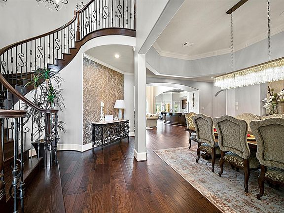 Texas-sized,resort-style outdoor living awaits on a rarely available lakefront lot in the prestigious gated section of Cinco Ranch! This exquisite custom-built 5-bedroom luxury home offers dramatic interiors,refined upgrades throughout,perfect for both grand entertaining & everyday comfort. Fresh interior paint,newly installed wood flooring,elegant designer lighting elevate the warm open-concept design. The family room impresses w/ cathedral ceiling & sweeping lake view. A gourmet chef’s kitchen w/tin ceiling,butcher block island,brick backsplash. The main level includes a spacious primary Suite & a private guest suite. Upstairs enjoy 3 generous bedrooms,an oversized game room w/ balcony,a media room. Step into your own backyard oasis on the lake: a spectacular pool w/dramatic fire bowls,spa,outdoor kitchen,stone fireplace & a basketball court overlooking the water. A 4-car garage & abundant storage,this exceptional home blends luxury, function, unforgettable resort-style living.