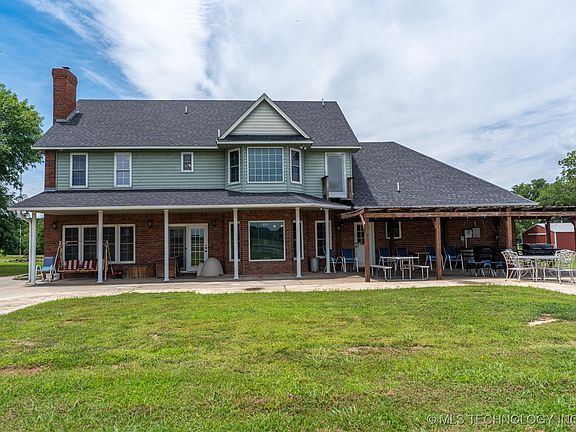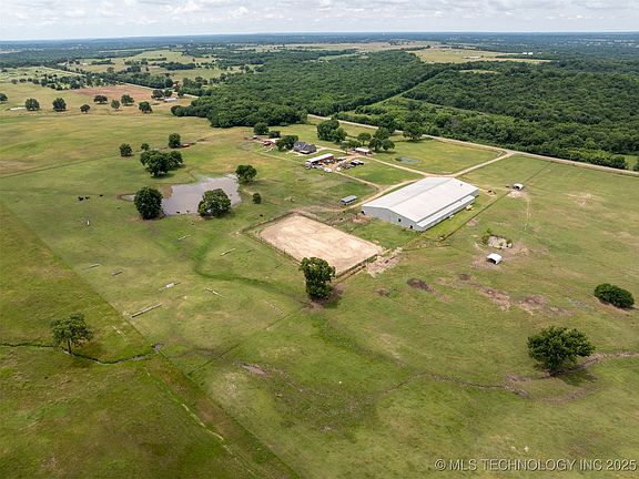 Welcome to the Dyer Ranch, a prime 40-acre m/l equine estate with all paved roads leading to the entrance. The main home is a two-story brick residence offering 4 bedrooms and 3.5 bathrooms. Inside, you'll find beautiful wood floors, granite countertops, a stunning staircase, and abundant closet space throughout. The home also features an attached garage, storm cellar, and a covered pergola out back where you can take in the stunning views—without a neighbor in sight. For the serious horse enthusiast or someone looking to generate income through events, the ranch includes a massive indoor arena-estimated 270'x155'. This impressive structure features 21 horse stalls-Tarter stalls are only 2 years old sizes include 10x10 and 10x12, a concession stand with commercial kitchen, men's and women’s restrooms, and an insulated announcer's stand, and separate judge’s stand. The arena is equipped with fiber internet, upgraded new LED lighting, fireplace, and a newer sound system—making it ideal for hosting ropings, barrel races, rodeos, clinics, shows or other equine events. Additionally, there is an outdoor arena-estimated 170'x260' equipped with lights. The property also offers a bunkhouse with attached horse stalls, a round pen, a additional horse barn with stalls, and eight outdoor stalls. Altogether, the property offers a total of 39+ horse stalls. There’s also a shop building for equipment, a set of cattle working pens, and lush pasture that’s ideal for either horses or cattle. The acreage is fenced and cross-fenced, with mature shade trees scattered, and there's a scenic pond located just behind the home. Whether you’re looking for a private horse haven, a working ranch, or an income-producing venue this property checks all the boxes. With unmatched facilities, location, and versatility, this is a truly rare opportunity in the heart of Oklahoma. Centrally located between Tulsa and Oklahoma City—only 60 miles in either direction—and offering easy access to I-40.