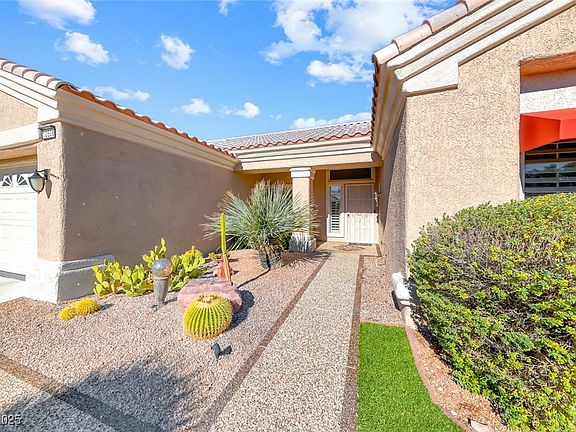 Charming single story home in the vibrant Sun City Summerlin 55+ community, offering a rare large fully fenced yard at an exceptional value. Professionally landscaped front & backyard feature elegant pebble stone & flagstone design with low-maintenance artificial turf. Bright, open floor plan with shutters throughout, crown molding & updated light fixtures. The kitchen offers stainless steel appliances, granite counters & open glass slider to the backyard. The private yard is ideal for relaxing or entertaining with extended covered patio & built-in BBQ. Enjoy access to multiple clubhouses, fitness centers, championship golf, pickleball, tennis, & endless clubs & activities. Ideally located near Downtown Summerlin shopping & dining with easy access to the 215, this move-in-ready home delivers lifestyle, space & value.