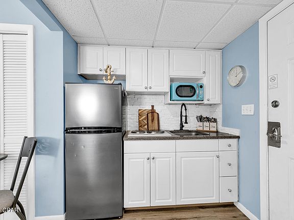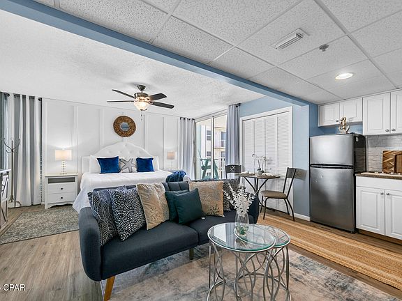 PRICE Dropped for Quick Sale - Motivated Seller of this Beautifully newly renovated Gulf Front studio with breathtaking private balcony views overlooking the white sugary sands and the Gulf of America. The condo is just steps from the beach. The lavish open living area boasts New LVP floors and features 55'' Smart HD TV and cable. Futon sofa, custom made twin bunk beds for optimal rental or family beach getaways. The kitchenette is fully functional as it has a stainless steel refrigerator with cooktop, microwave, granite countertops with ample cabinet space. Relax in the Luxurious King bed, new comfortable mattress and with stunning Gulf views from the bed. New blackout curtains for relaxing evenings in. The bathroom has a granite vanity, walk in shower with rainfall shower head. This studio has its own laundry room with a new washer and dryer. ''This stunning condo has it all''