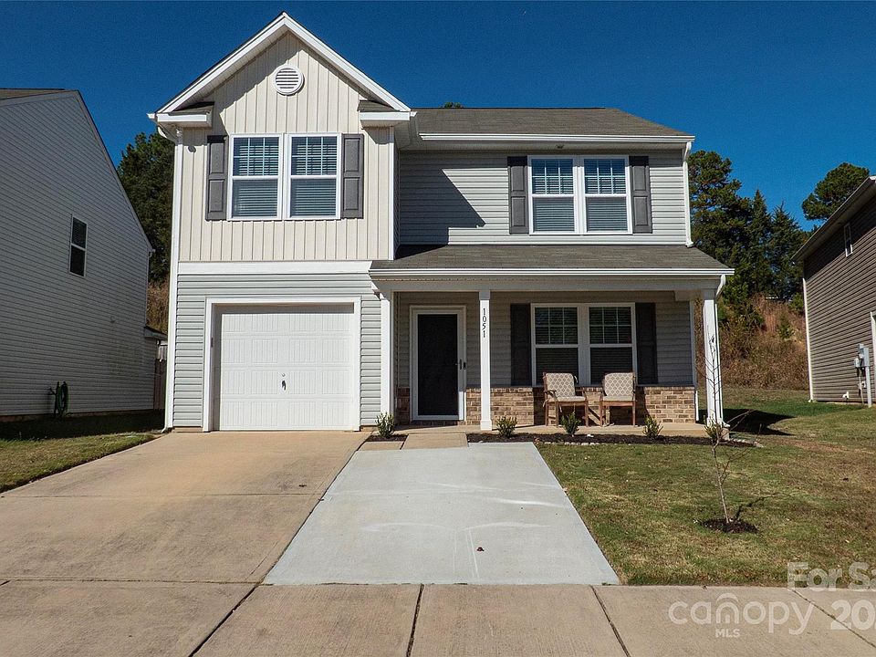 Welcome to this beautifully maintained, spacious, move-in ready home! From the inviting covered front porch to the quaint backyard with extended concrete patio, the views from the front and back of this cut-de-sac home are of natural areas owned by the HOA! Leave the front door open and welcome in fresh air through the screen door as natural light shines on the vinyl plank flooring that extends throughout the main level. These floors are scratch and water resistant making for easy care with a modern feel. An office with French doors provides a quiet space for work or study, and a large drop zone provides a dedicated space for everyday needs. The spacious kitchen features granite countertops, tile backsplash, abundant cabinetry, a center island, and all major appliances—including a refrigerator, microwave, glass top electric range, and dishwasher. The kitchen flows effortlessly to the large living room through one of the many arched openings featured throughout this home. The dining room is located off the kitchen and features updated lighting and room for a crowd. Upstairs, enjoy brand-new carpet throughout the thoughtfully designed layout. The oversized primary suite features a ceiling fan, three large windows overlooking the private backyard, a generous walk-in closet, and full bath ensuite with a duel sink vanity. Two additional large secondary bedrooms—one with its own walk-in closet—share a full hall bath with a linen closet. Additional conveniences include a laundry room with Whirlpool washer and dryer, zoned HVAC for multi-level comfort, and a utility closet for easy access to system components. The single-car garage offers extra storage, and the extended driveway provides side-by-side parking. Enhanced by a security system with cameras, this home combines peace of mind with practical comforts. With its fresh updates, functional floor plan, and premium features, this home is truly ready for you to move right in!