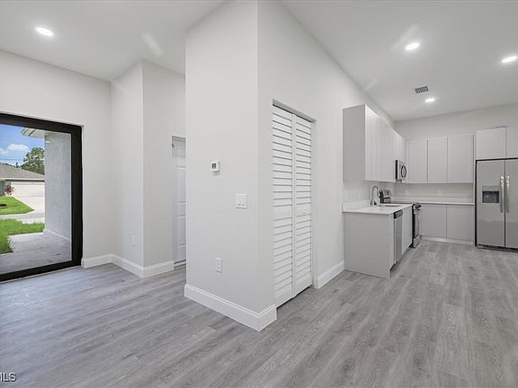 Be the first to occupy this home in Lehigh Acres! This new construction home built in 2025 is the perfect blend of modern comfort and fabulous functional details with 1588 square feet of open and bright living space, this home boasts 3 spacious bedrooms with 2 well-appointed bathrooms and a double car garage. This wonderful, open-air-floor plan is complemented by a stylish kitchen with quartz countertops and stainless-steel appliances. The master bedroom, overlooking the backyard, has a wonderful bath with dual sinks and a large shower and closet. One of the standout features of this home is its’ fantastic front driveway and outdoor space. This energy efficient home has hurricane impact resistant windows for quiet and safety along with a rear concrete patio lanai, which makes a great playground for children and pets. Sip your morning coffee on the patio or enjoy hosting memorable barbecues with friends and family; this home is designed for both relaxation and entertainment.